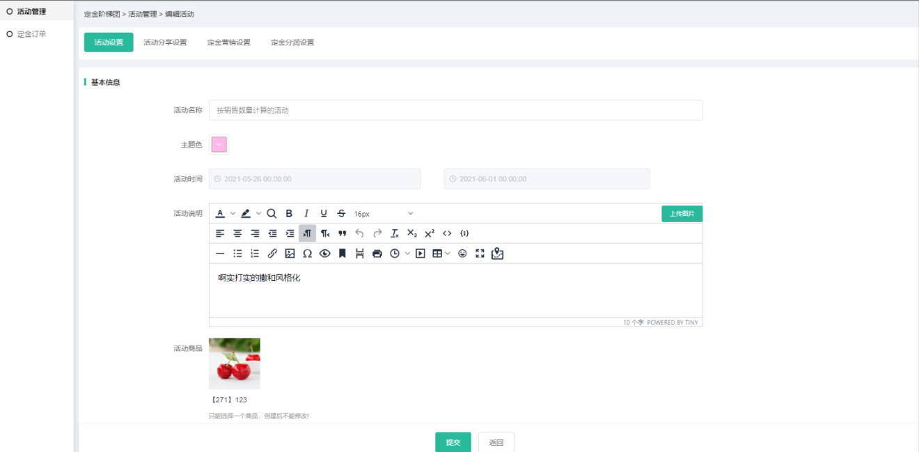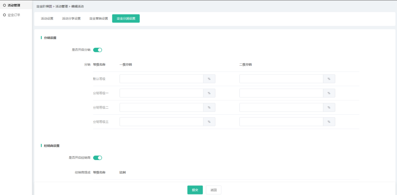 (4)营销设置和分润可设置活动定金的营销及分润信息,相应插件如未开启,则无法     设置,分润中所有插件都没开启则不会有分润设置导航;