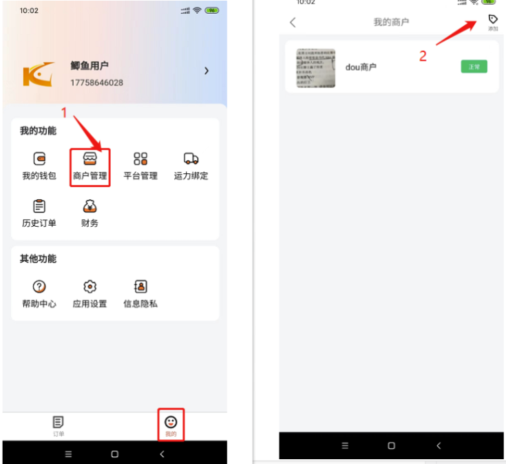 进入鲫鱼APP,底部菜单--我的--商户管理--添加商户(所属地区需扫码绑定鲫鱼代理管理后台的二维码来绑定)