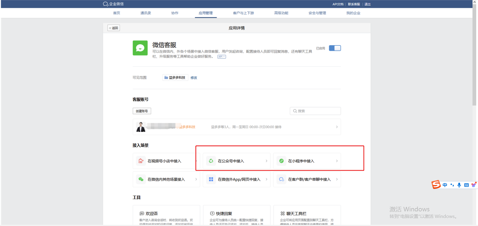 (若发现没有“去接入”按钮,请检查是否“已启用”微信客服)